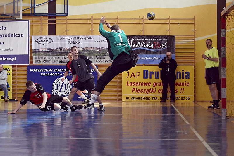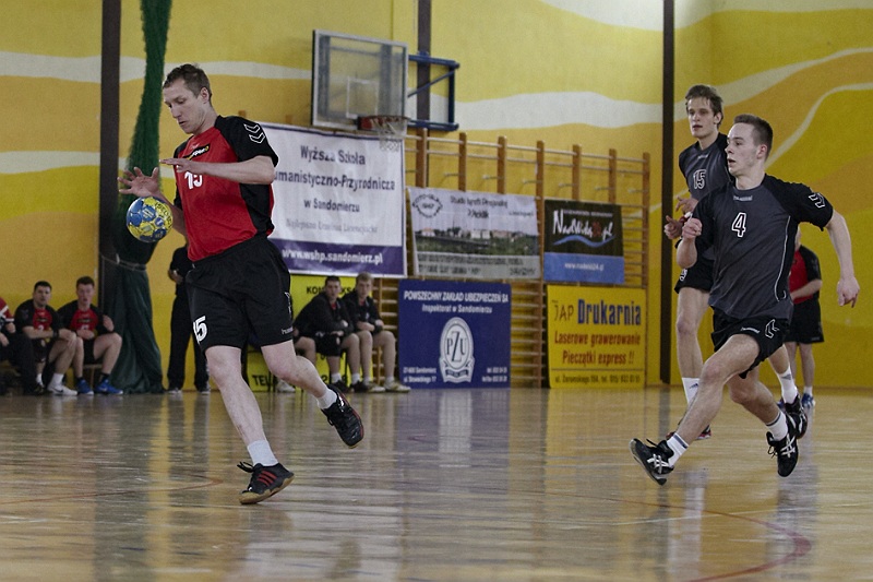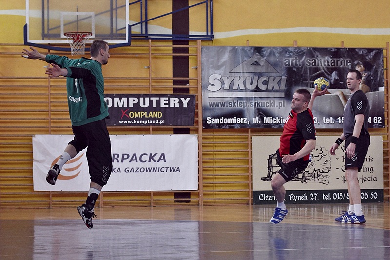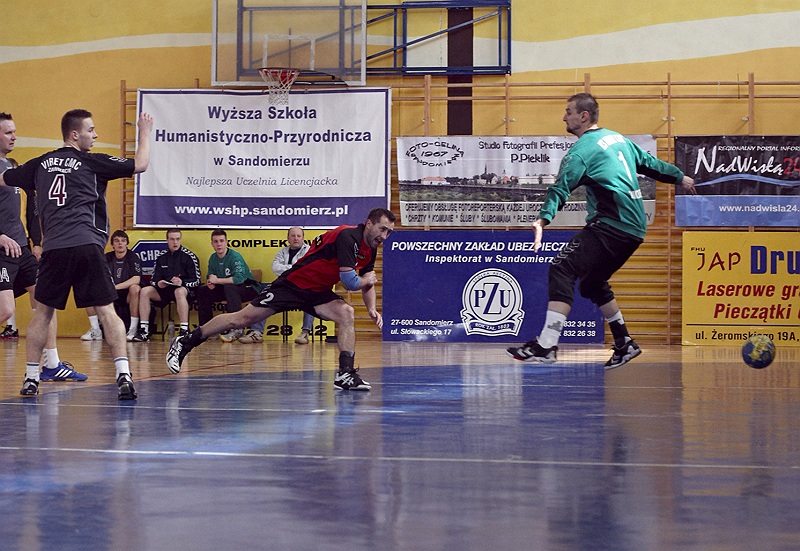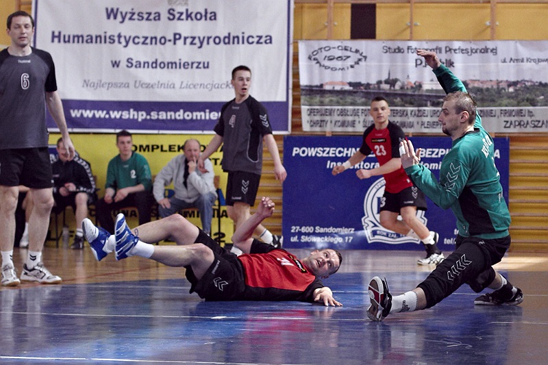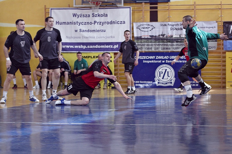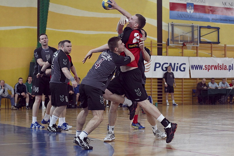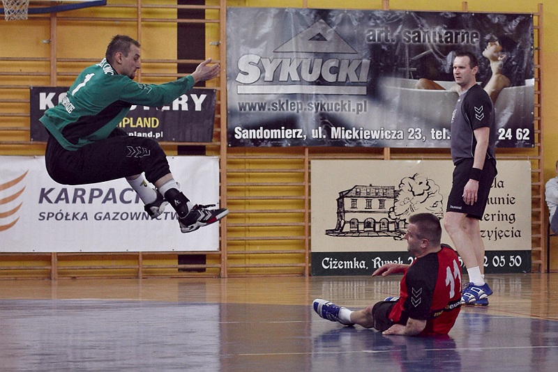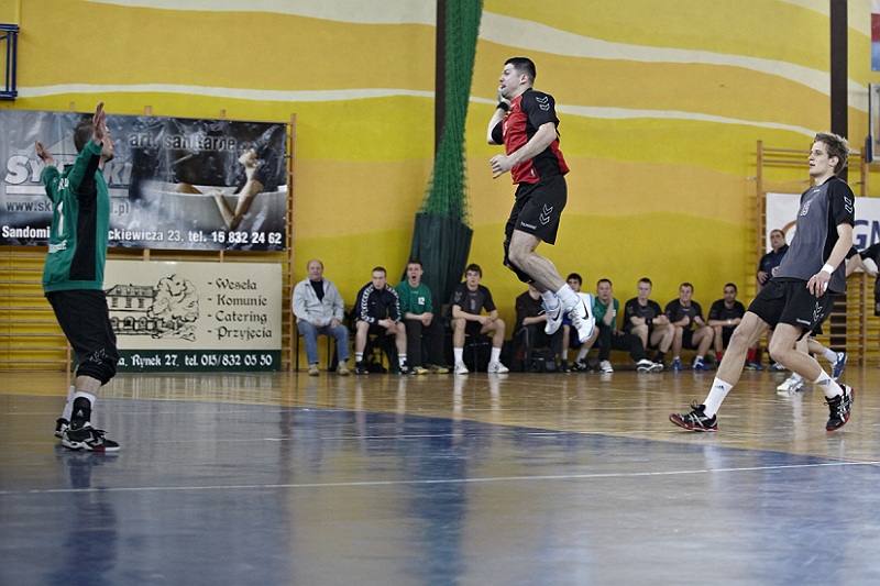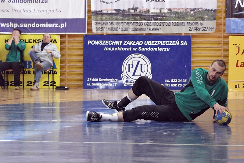 Pierwsza połowa spotkania była bardzo wyrównana, żadna z drużyn nie osiągnęła wysokiej przewagi, walka toczyła się niemal bramka za bramkę. Indywidualnie kryty Marcin Ogrodnik z trudem zdobywał pozycję do oddania rzutu, natomiast świetnie spisujący się tego dnia rozgrywający gości Krzysztof Kurełek raz po raz umieszczał piłkę w bramce Sandomierzan.