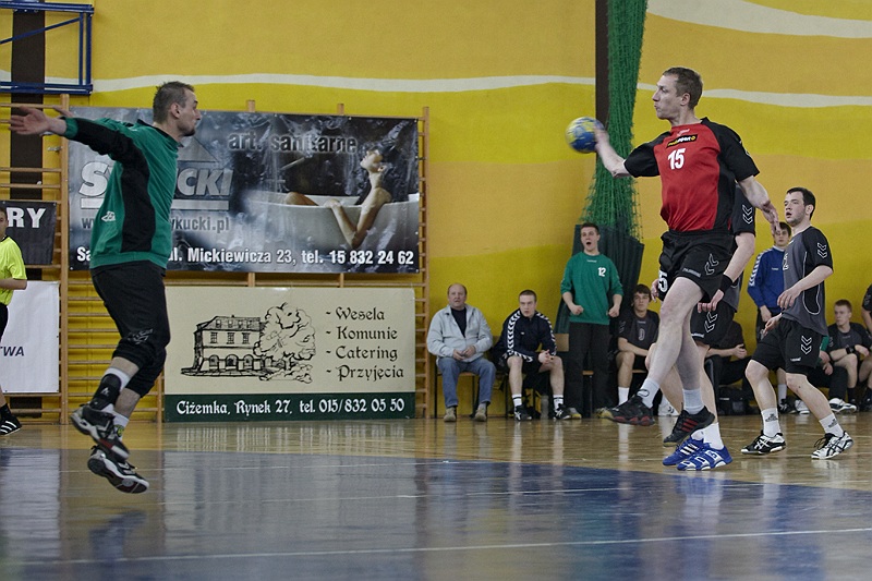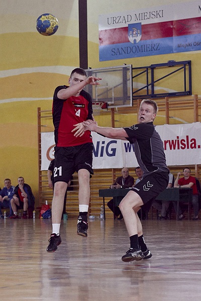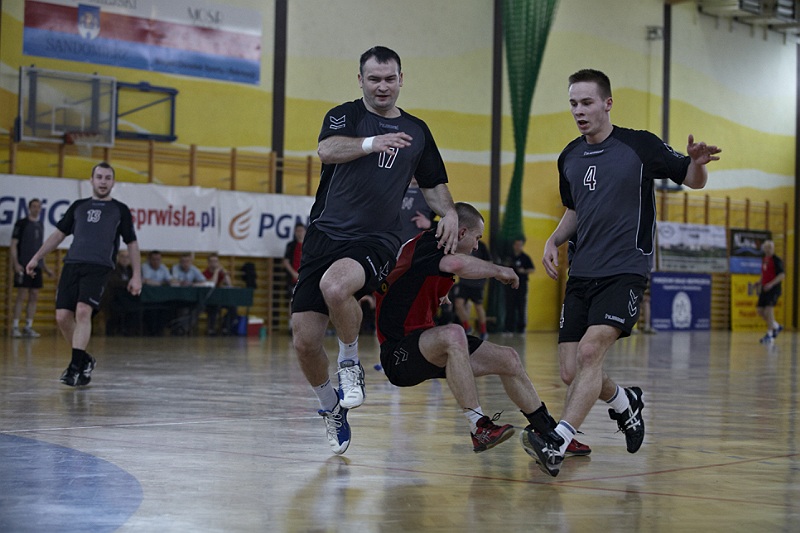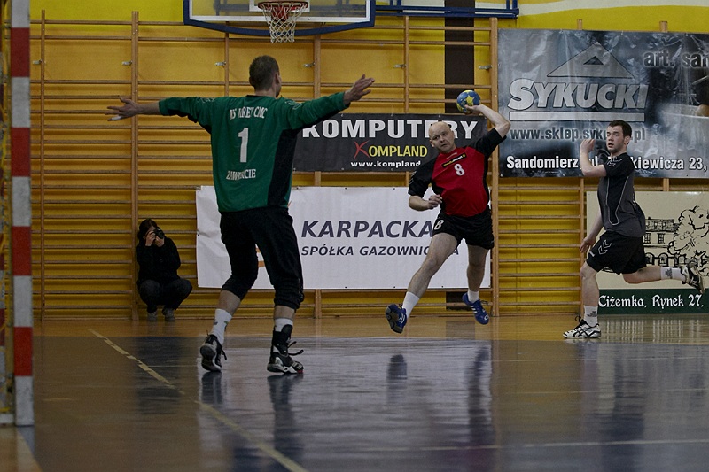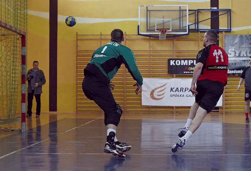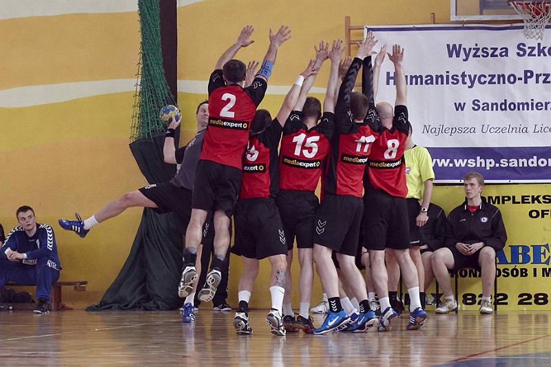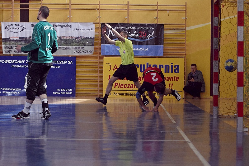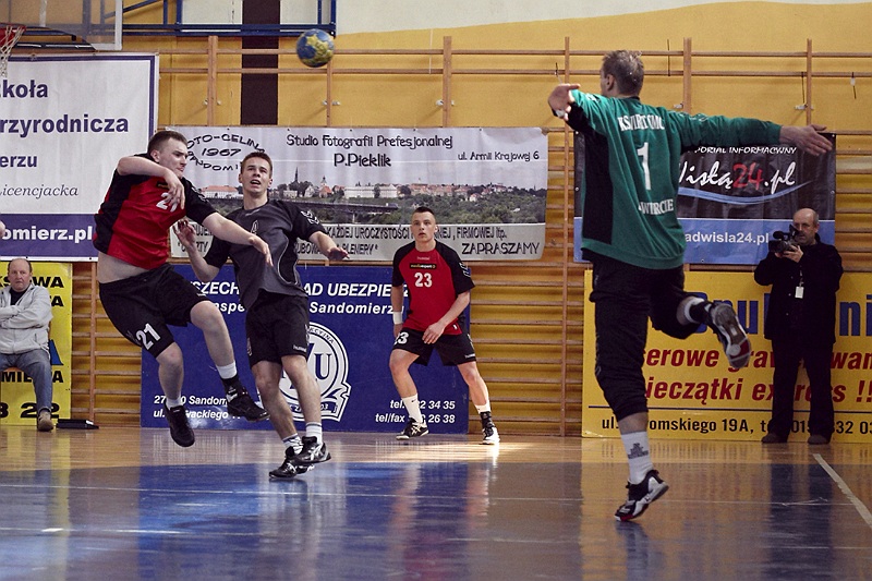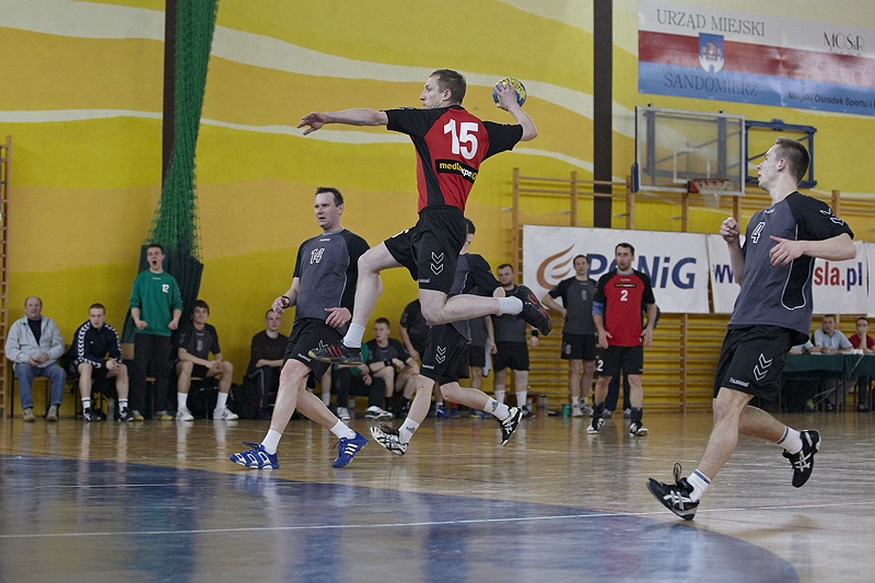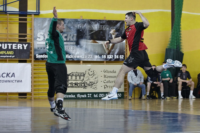 Pierwsza połowa spotkania była bardzo wyrównana, żadna z drużyn nie osiągnęła wysokiej przewagi, walka toczyła się niemal bramka za bramkę. Indywidualnie kryty Marcin Ogrodnik z trudem zdobywał pozycję do oddania rzutu, natomiast świetnie spisujący się tego dnia rozgrywający gości Krzysztof Kurełek raz po raz umieszczał piłkę w bramce Sandomierzan.
