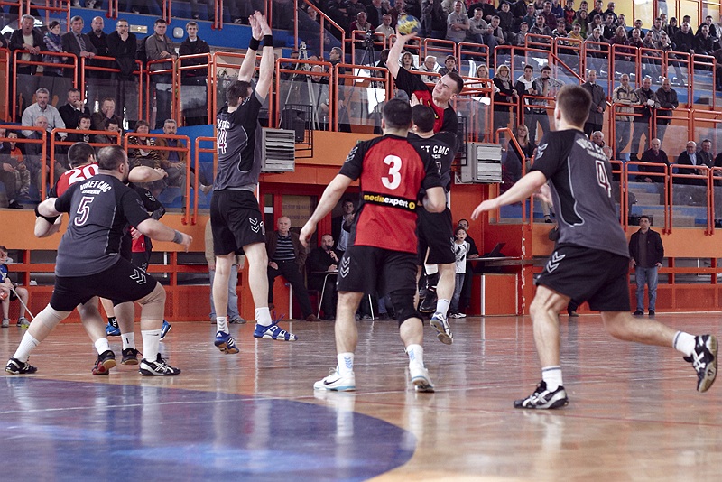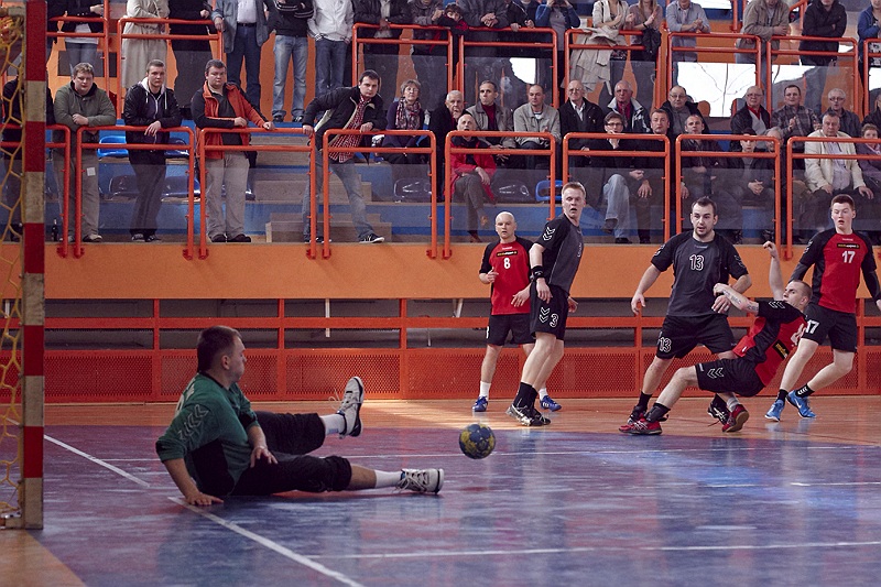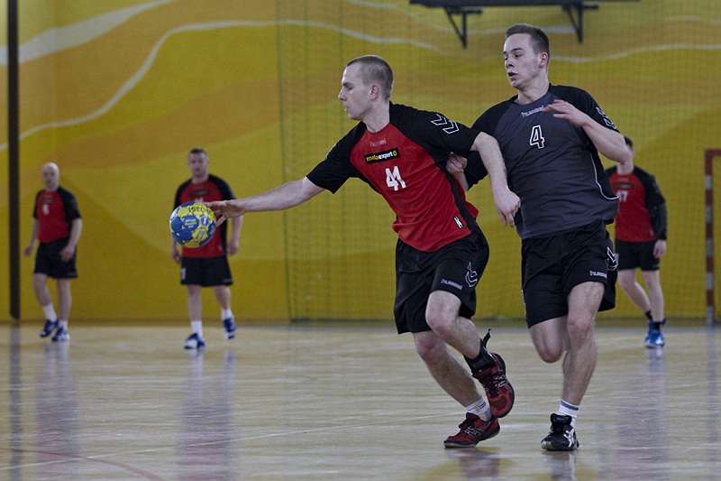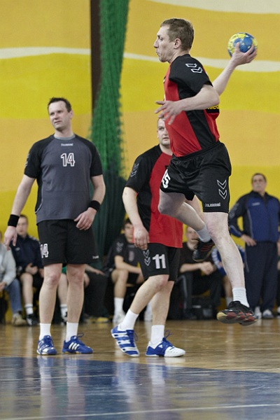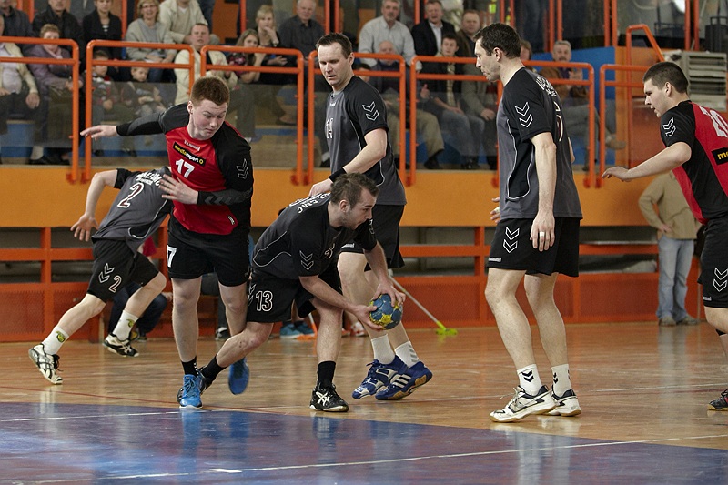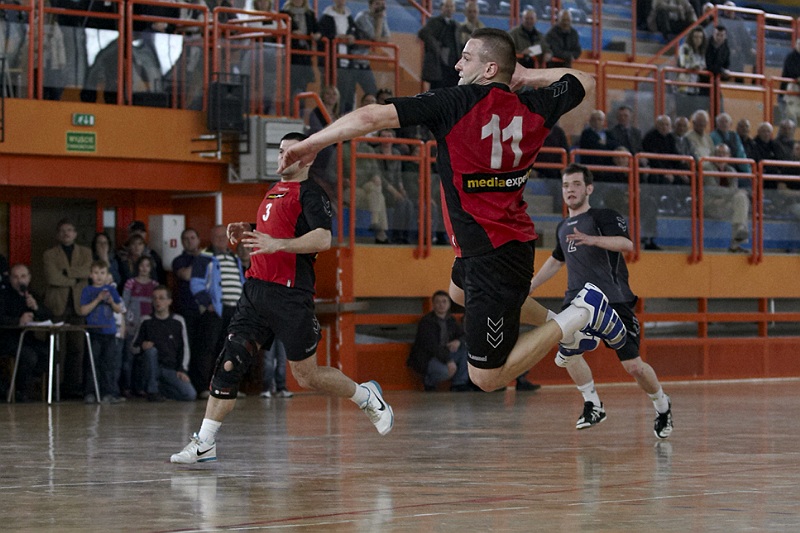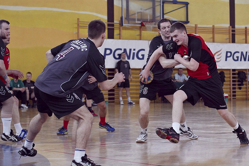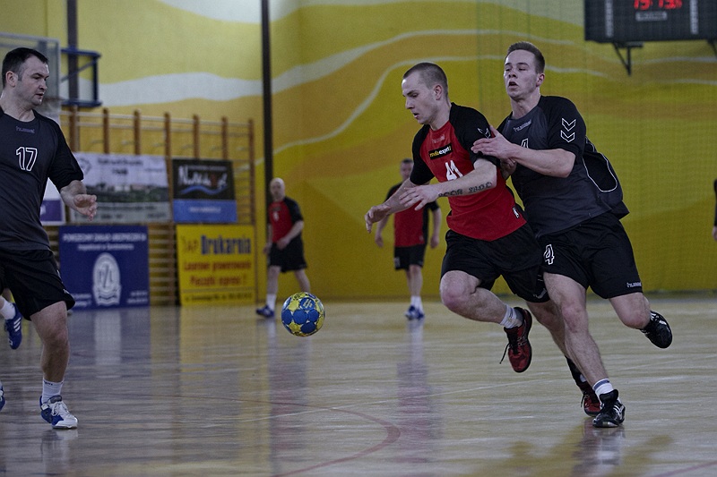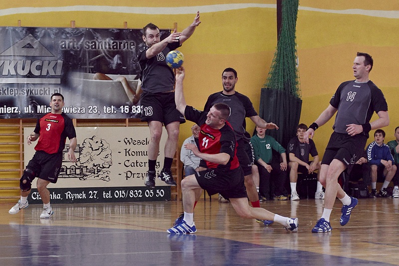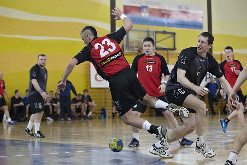 Pierwsza połowa spotkania była bardzo wyrównana, żadna z drużyn nie osiągnęła wysokiej przewagi, walka toczyła się niemal bramka za bramkę. Indywidualnie kryty Marcin Ogrodnik z trudem zdobywał pozycję do oddania rzutu, natomiast świetnie spisujący się tego dnia rozgrywający gości Krzysztof Kurełek raz po raz umieszczał piłkę w bramce Sandomierzan.