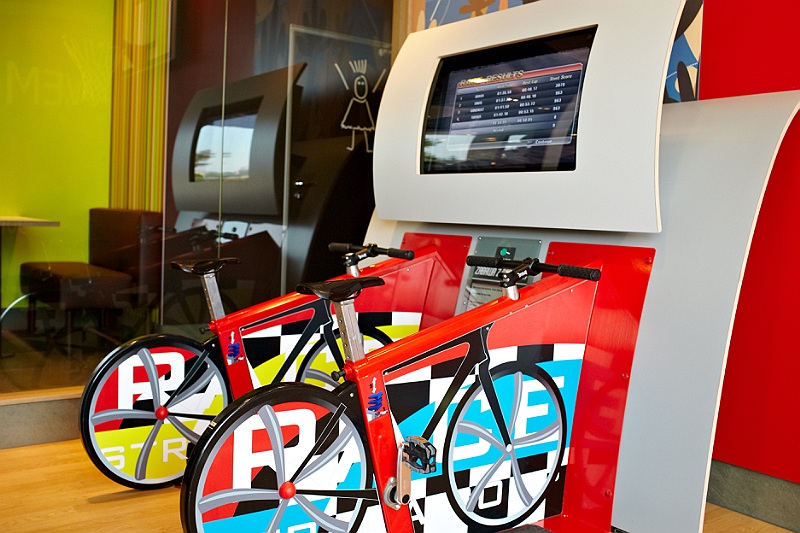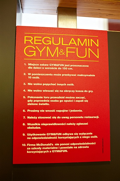 Restauracja posiada również strefę Gym&Fun- interaktywne miejsce zabaw dla dzieci, z mini boiskiem do koszykówki, torem jazdy na rowerze i torem do biegu z przeszkodami.