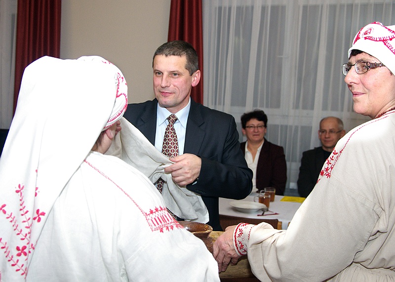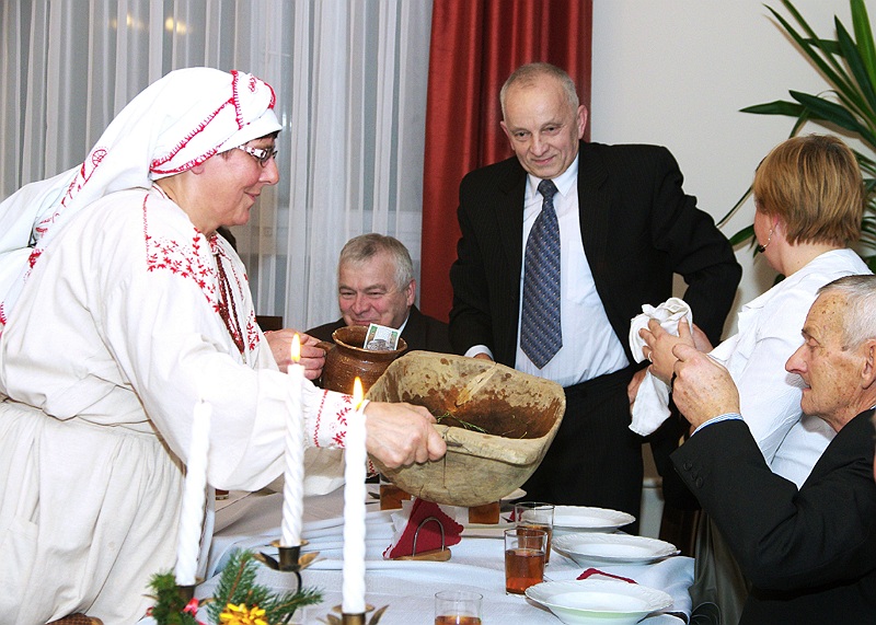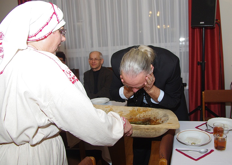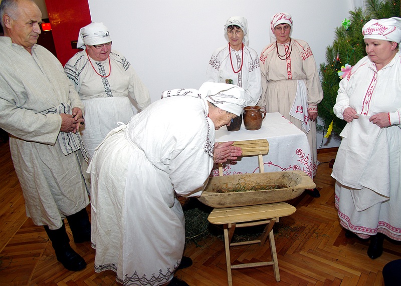 Jednym z tradycyjnych elementów lasowiackiej wigilii jest umycie twarzy w niecce z wodą, w której jest garść siana i pieniążek. –„ Gębę powinny umyć przede wszystkim dziewuchy i kobity żeby były ładne i gładkie przez cały rok” – zachęcała Hanka Rzeszutka, szefowa baranowskich Lasowiaczek.