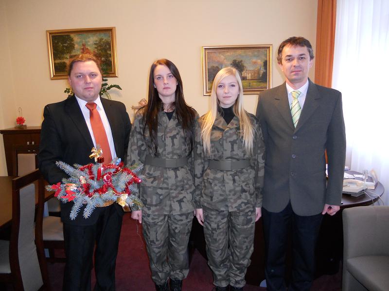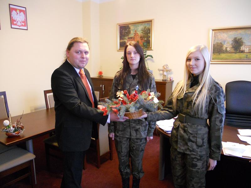 Pięknie przyozdobiony stroik wraz z świątecznymi i noworocznymi życzeniami przekazały staroście, w obecności dyrektora placówki, dwie uczennice gorzyckiej szkoły średniej uczęszczające do nowo powstałej klasy mundurowej.