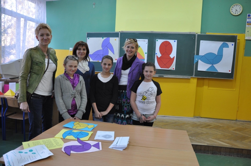 Dzieci przeglądały także książki, albumy, podręczniki oraz zeszyty. Lekcja matematyki cieszyła się również ogromnym zainteresowaniem. Dzieci wzięły udział w grach i zabawach, wyklejały tangram oraz Jajko Kolumba.
