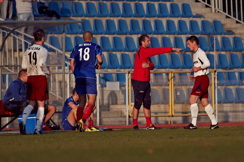 Od pierwszych minut spotkania to goście przeważali na boisku, a Wiślacy zepchnięci do defensywny nie byli w stanie przemieścić futbolówki w okolice pola karnego rywala. Na szczęście dla Sandomierzan, strzały piłkarzy Wiernej w większości przypadków były nieprzygotowane i albo mijały bramkę Wisły albo trafiały w ręce świetnie spisującego się tego dnia bramkarza Wisły Daniela Furtaka, który zastąpił w bramce kontuzjowanego Mateusza Kuśmierza. Otwarta gra Wiernej przyniosła połowiczne skutki w 37 minucie, kiedy to sędzia podyktował rzut karny za faul którego nie było (sytuację można zobaczyć w skrócie video). Przy okazji, za dyskusję z sędzią żółtą kartką ukarany został kapitan Wisły Grzegorz Rzeszutek. Na szczęście w tym wypadku przysłowie o sprawiedliwej oliwie zadziałało, futbolówka strzelona przez Pawła Bienia wylądowała wprost w rękach świetnie ustawionego Daniela Furtaka. Kilka minut później w 45 minucie meczu świetną sytuację do otworzenia wyniku miał Damian Nogaj, niestety piłka po strzale z rzutu wolnego z odległości ok. 30 m minimalnie minęła bramkę.