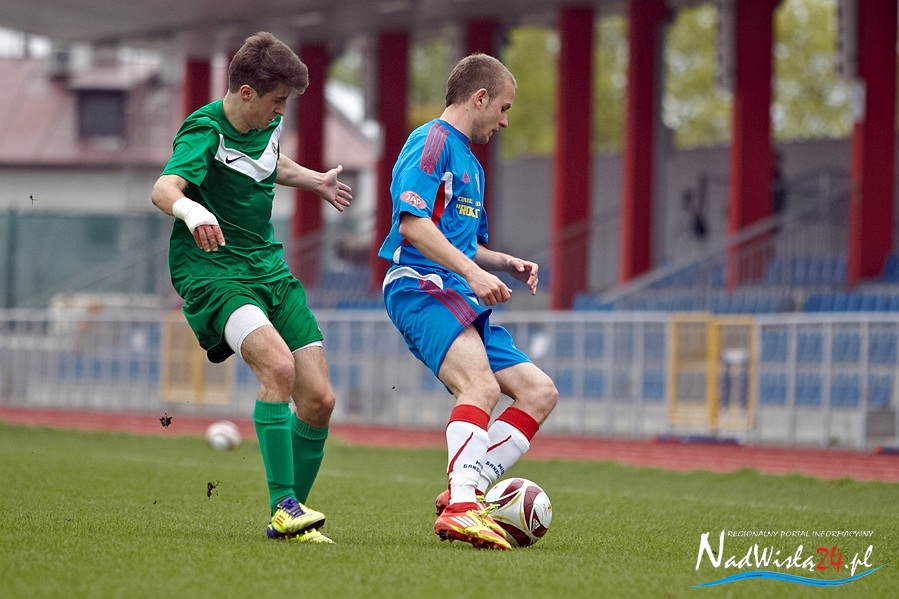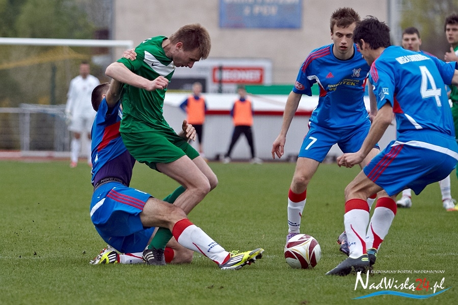 Od początku spotkania obie drużyny próbowały zaskoczyć rywali, ale zarówno jednym jak i drugim brakowało ostatniego podania i wykończenia. Sytuacja zmieniła się w 40 minucie meczu, wtedy to sędzia podyktował „11” dla drużyny z Myślenic, pewnie wykorzystaną przez Patryka Banaszkiewicza.