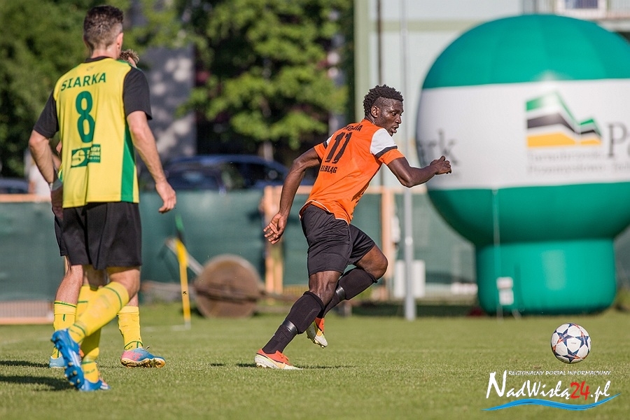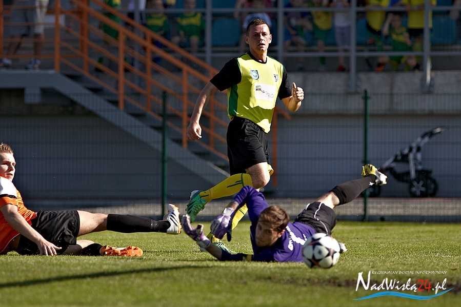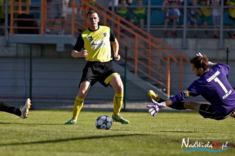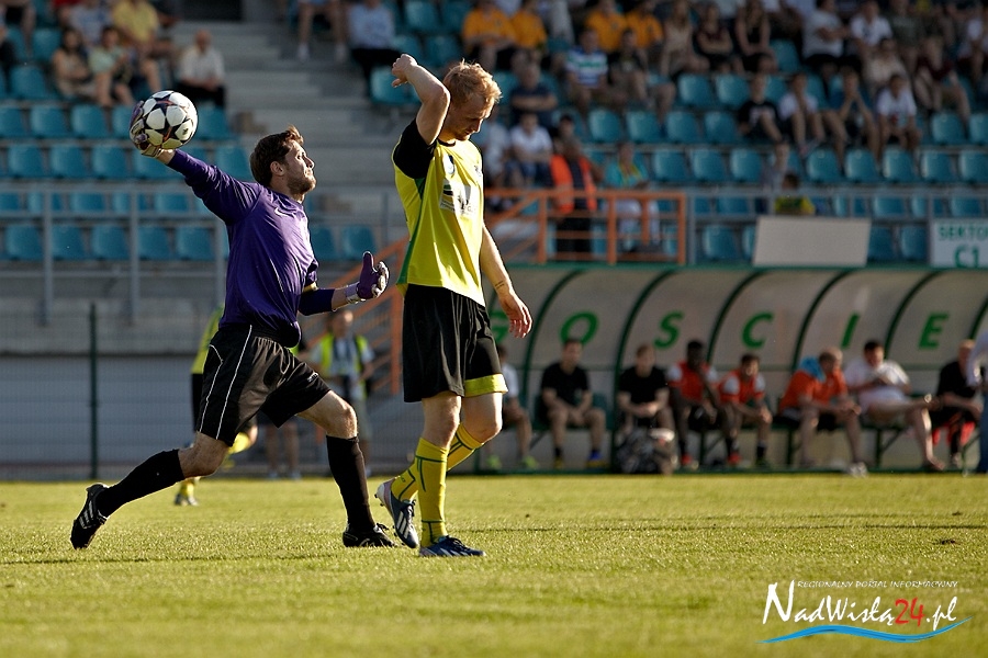 Fortuna nie dopisała również w 76 minucie Truszkowskiemu, który naprawdę nieznacznie się pomylił uderzając z około 10 metrów od celu. Pięć minut później jeszcze bliżej szczęścia był Nadolski, który zamykając dośrodkowanie z lewej strony boiska trafił w boczną siatkę bramki Matłoki. Dla odmiany w 83 minucie to goście z Elbląga mogli mówić o pechu. W sytuacji sam na sam z golkiperem Siarki znalazł się Patryk Galeniewski. Był chyba jednak aż tak tym faktem zaskoczony, że zupełnie niepotrzebnie zszedł do środka próbując minąć Melona. Doświadczony bramkarz gospodarzy wyczuł jego intencje i momentalnie złapał piłkę.