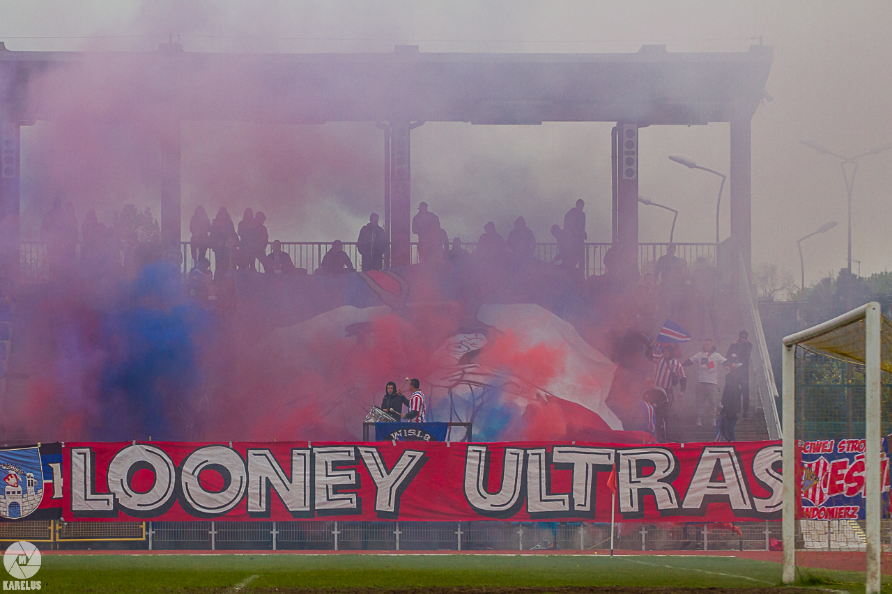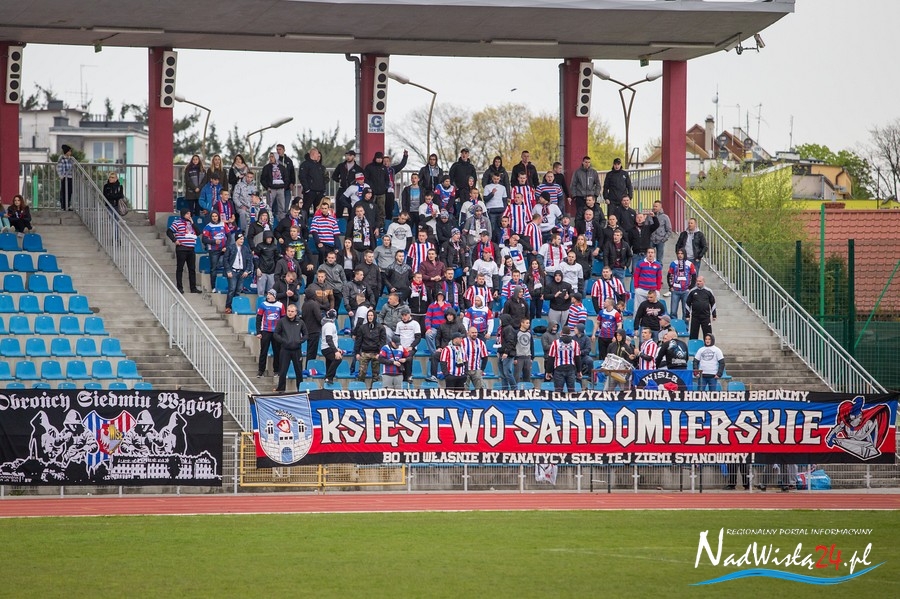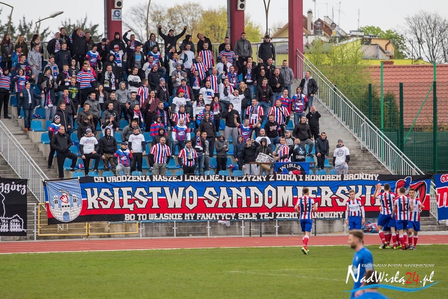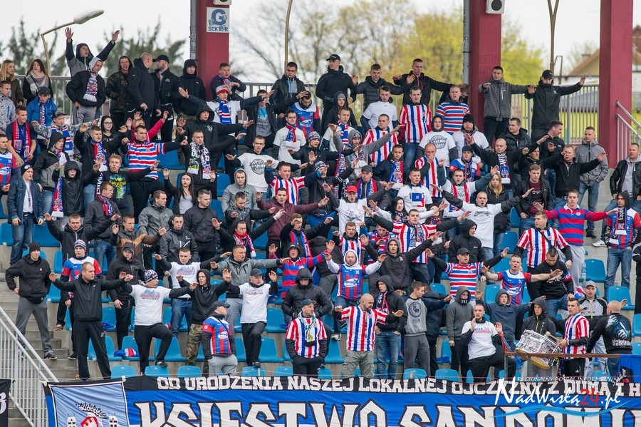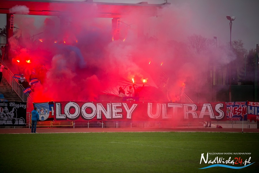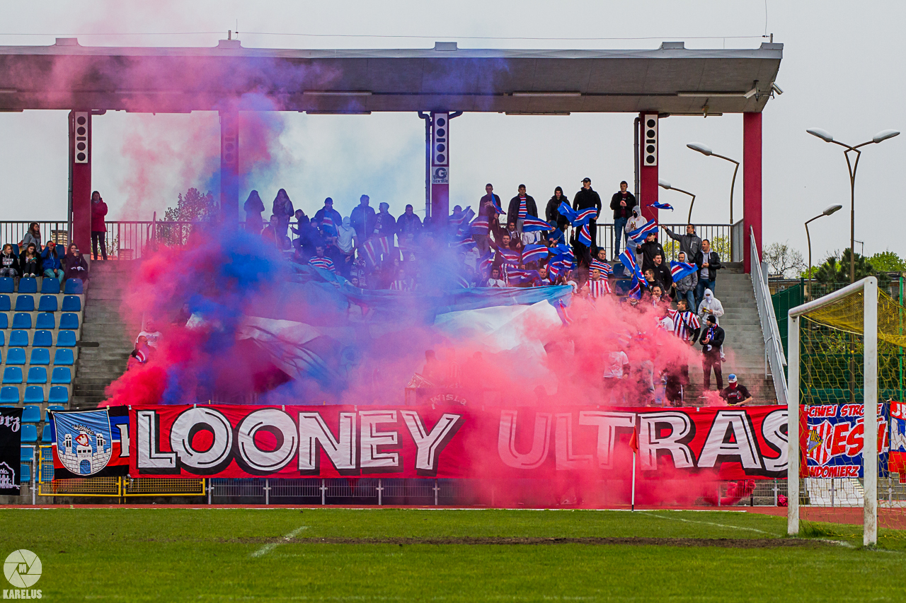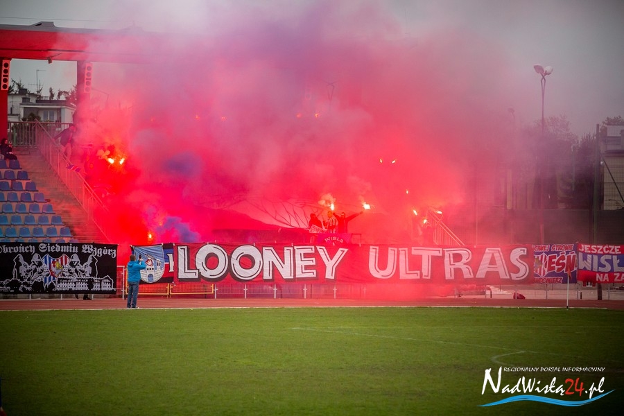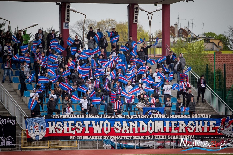 Podczas niedzielnego meczu Wisły Sandomierz z Unią Tarnów kibice sandomierskiej drużyny przygotowali efektowną oprawę.