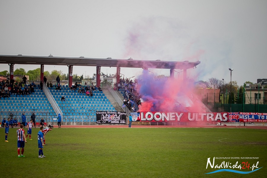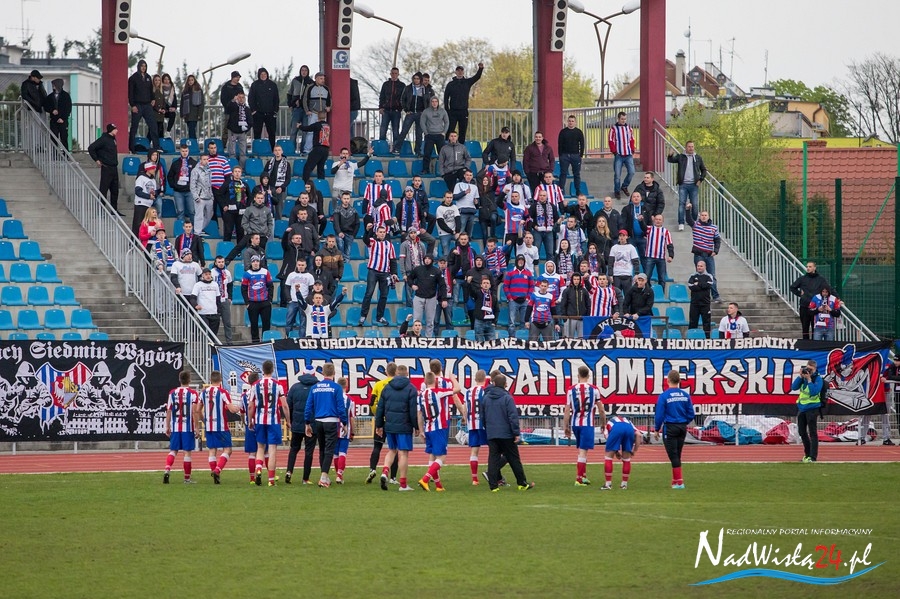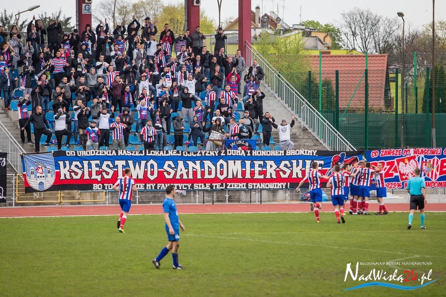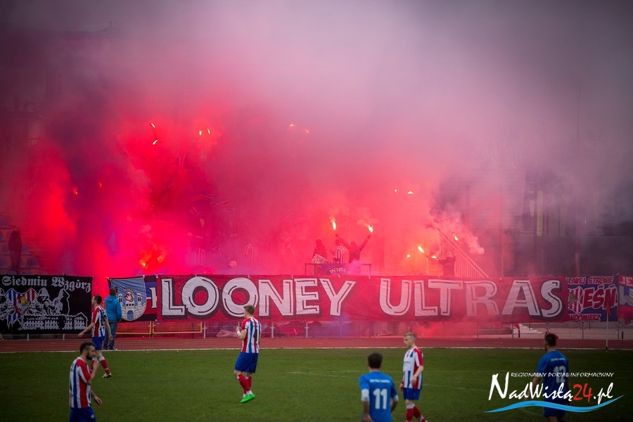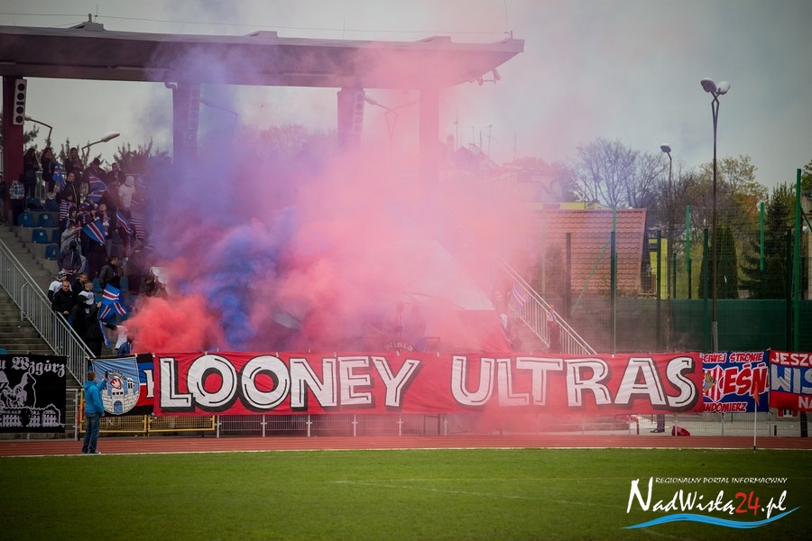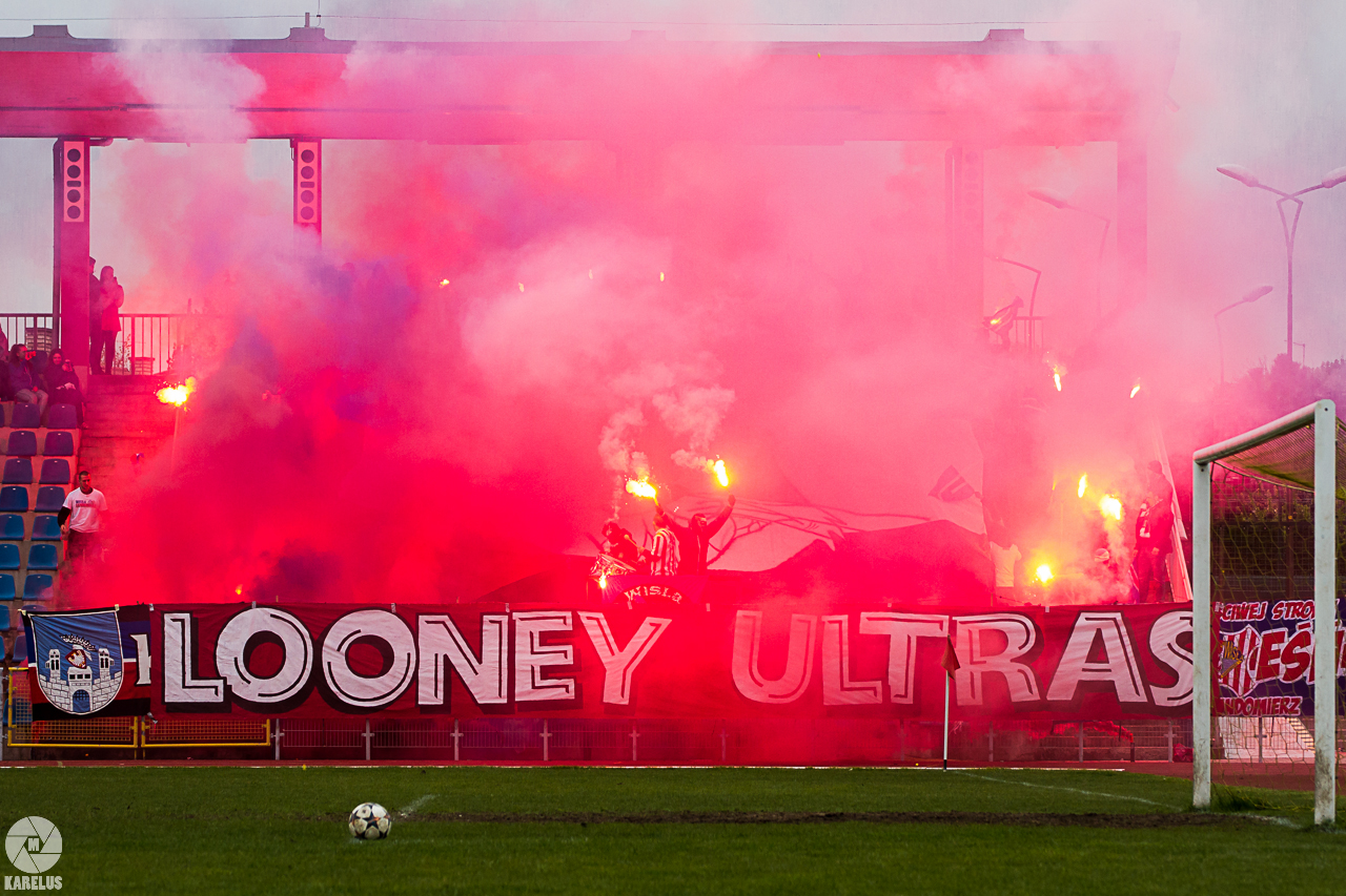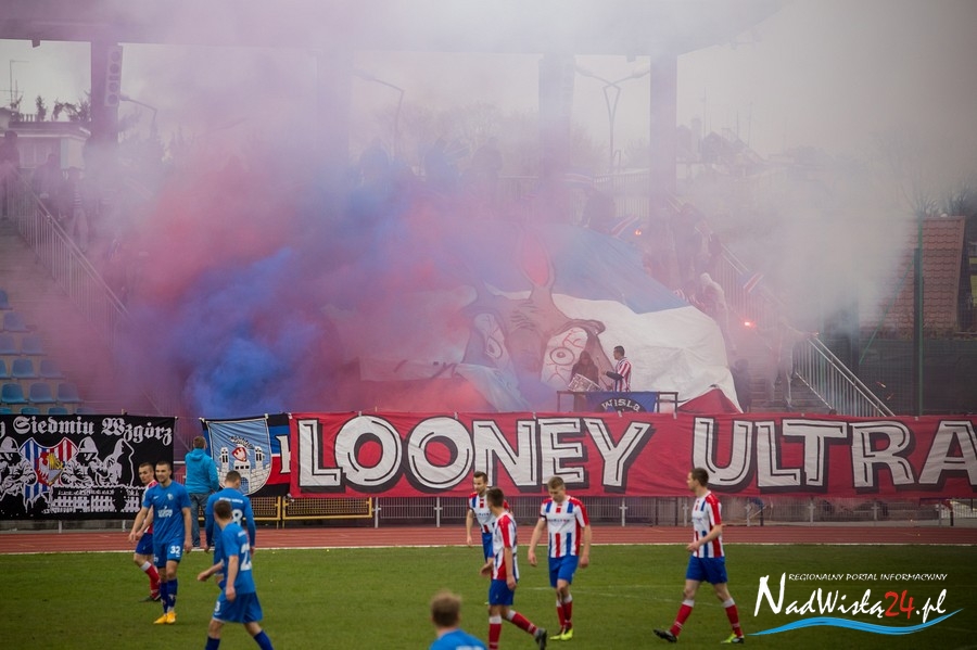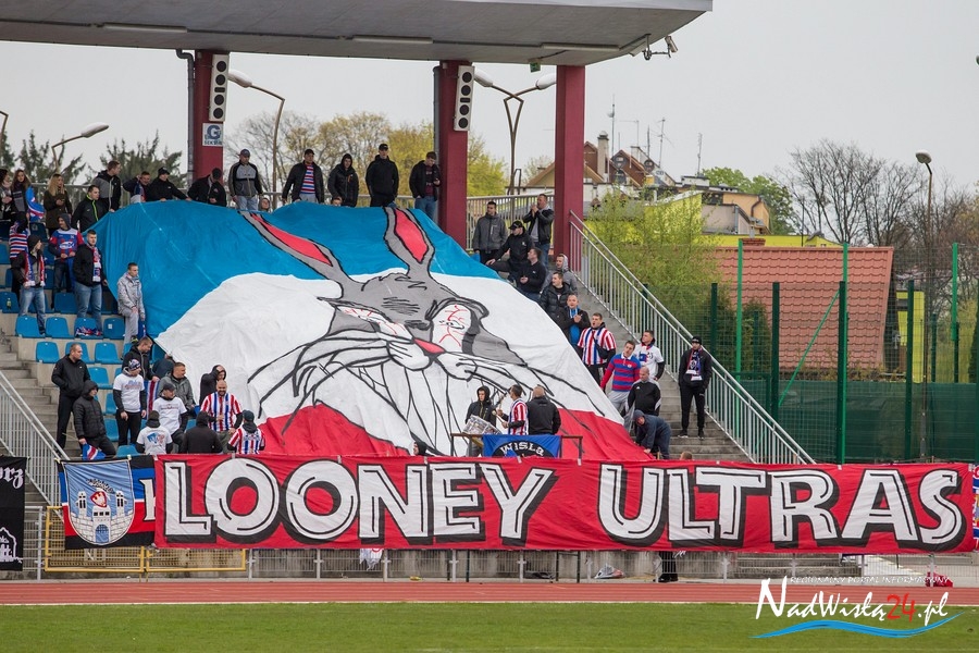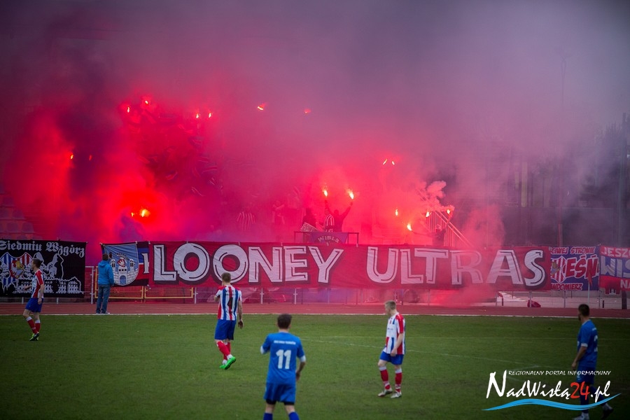 Podczas niedzielnego meczu Wisły Sandomierz z Unią Tarnów kibice sandomierskiej drużyny przygotowali efektowną oprawę.