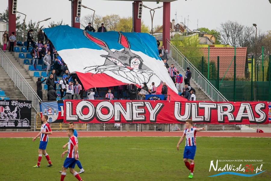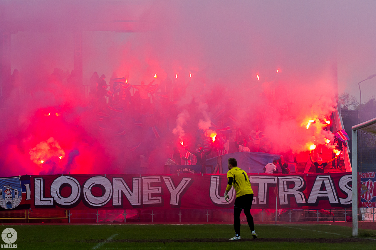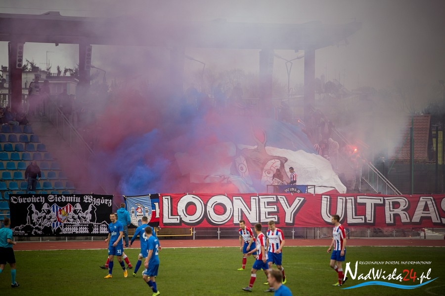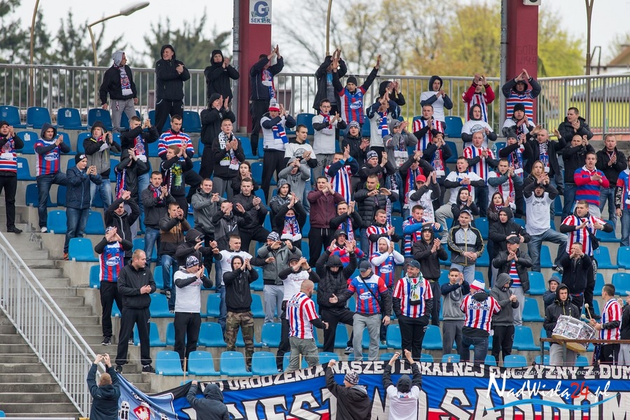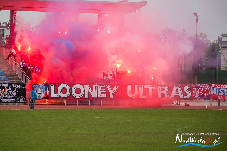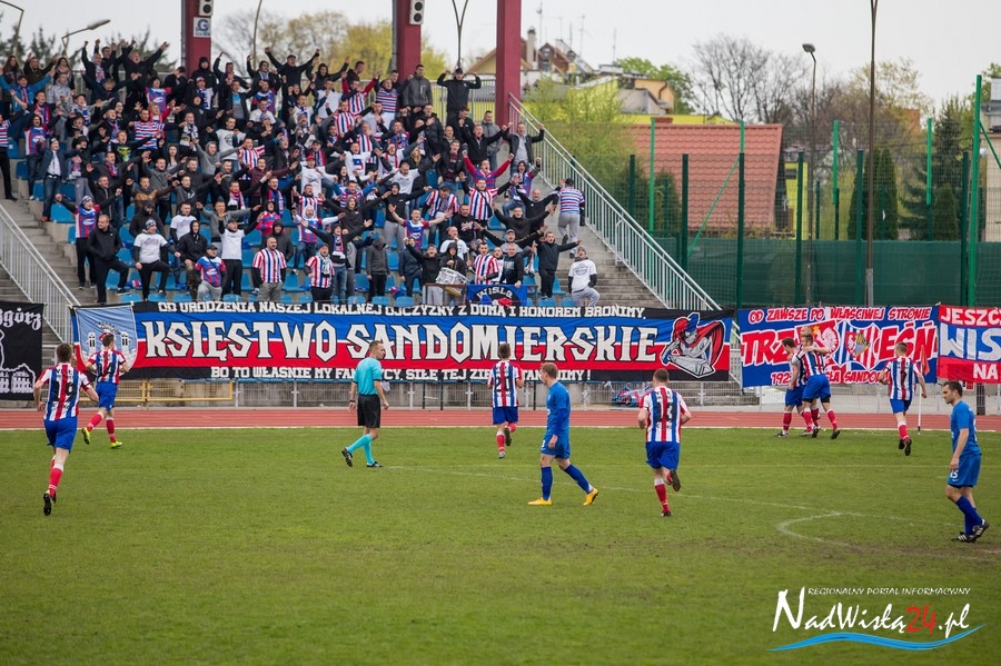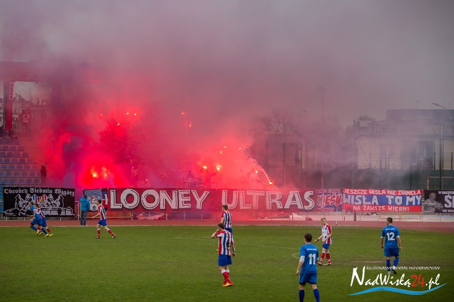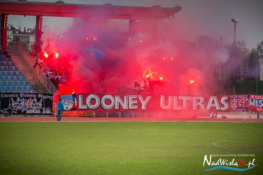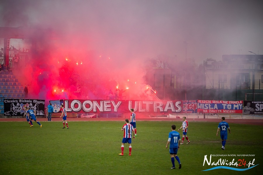 Podczas niedzielnego meczu Wisły Sandomierz z Unią Tarnów kibice sandomierskiej drużyny przygotowali efektowną oprawę.