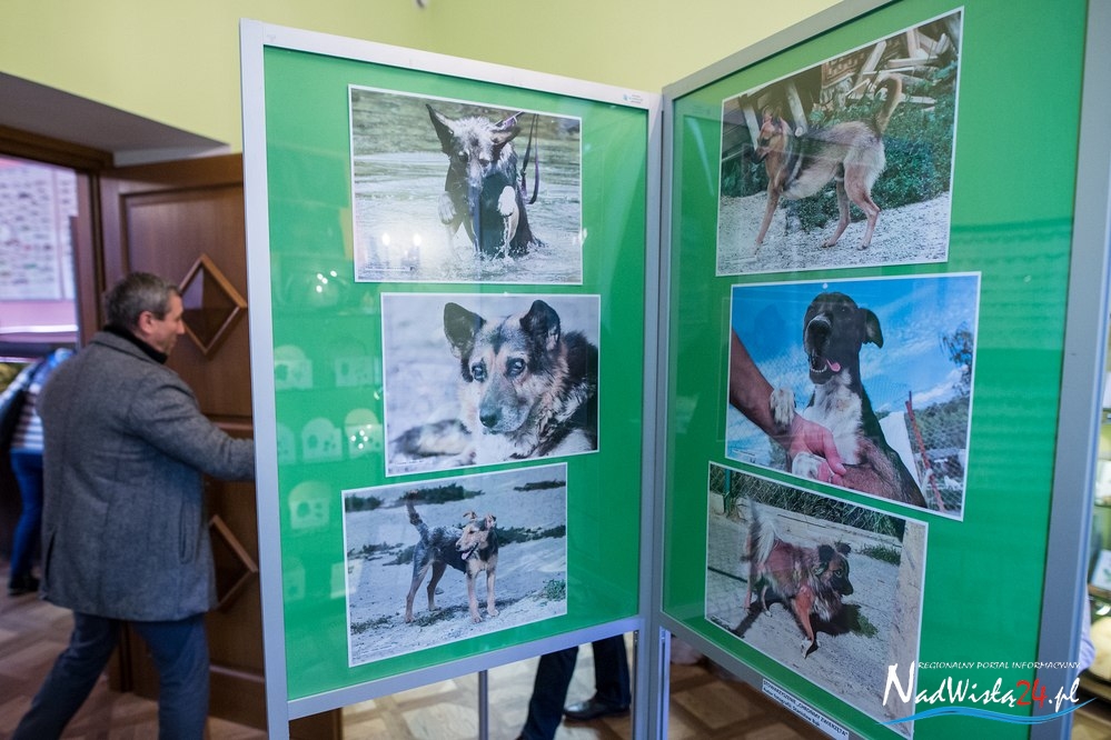 – To jest Korek, piesek uwolniony z wnyków, fizycznie wszystko jest już w porządku, ale wciąż się boi, ucieka do budy. Ja mogę go z tej budy wyciągnąć i głaskać, lecz kiedy tylko popuszczę to wraca do budy. Za siatką zaś szczeka jak opętany i wygląda jak groźny pies. Jednak taki nie jest, człowiekowi nic nie zrobi bo się go za bardzo boi – opowiada pani Agnieszka o jednym z bohaterów wystawy. – Tu jest Grant który został wyłowiony w grudniu ubiegłego roku ze stawu w Sobowie, przeszedł operację, taki smutny stary piesek, nie wiadomo dlaczego znalazł się w stawie, niestety już nie żyje