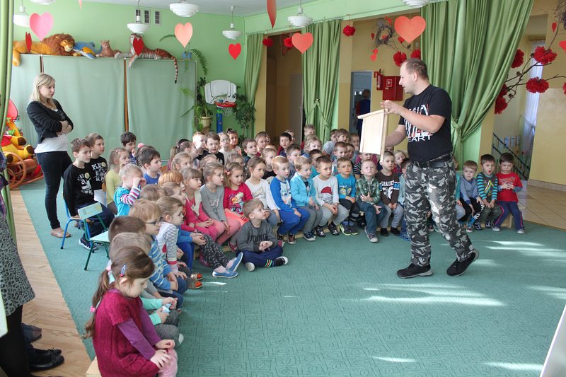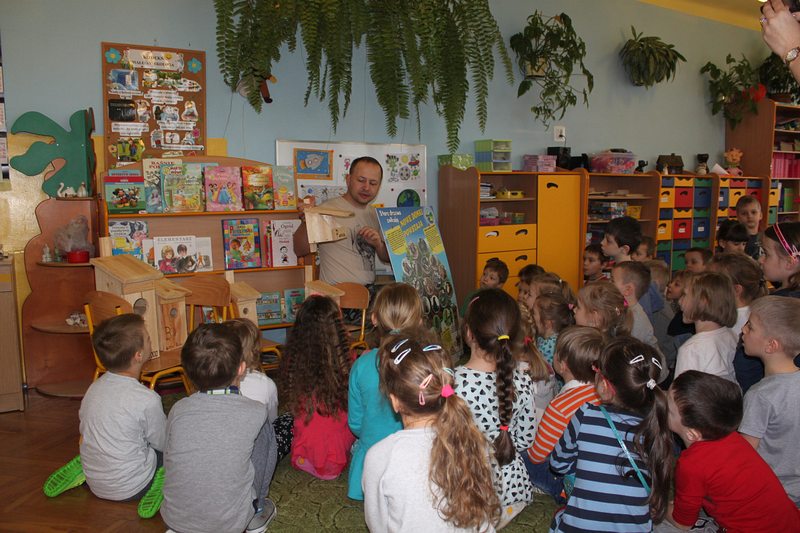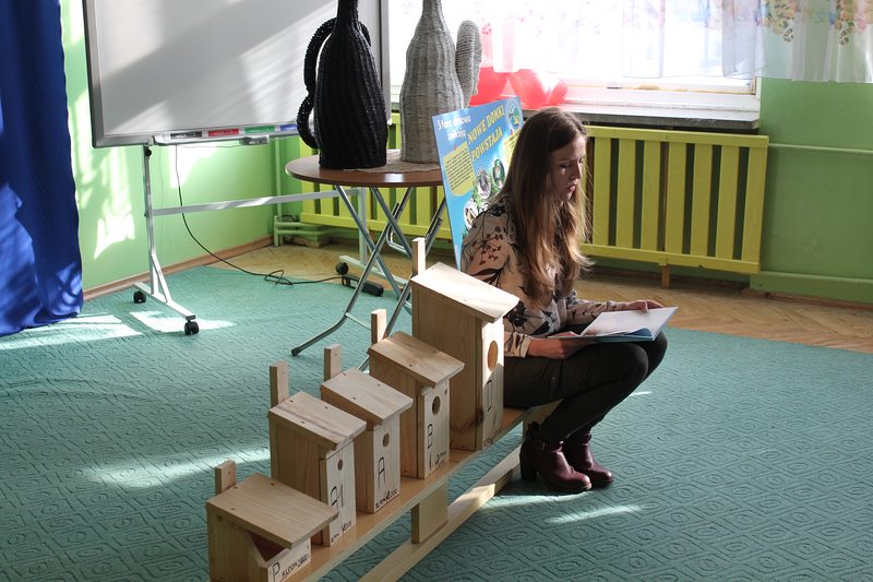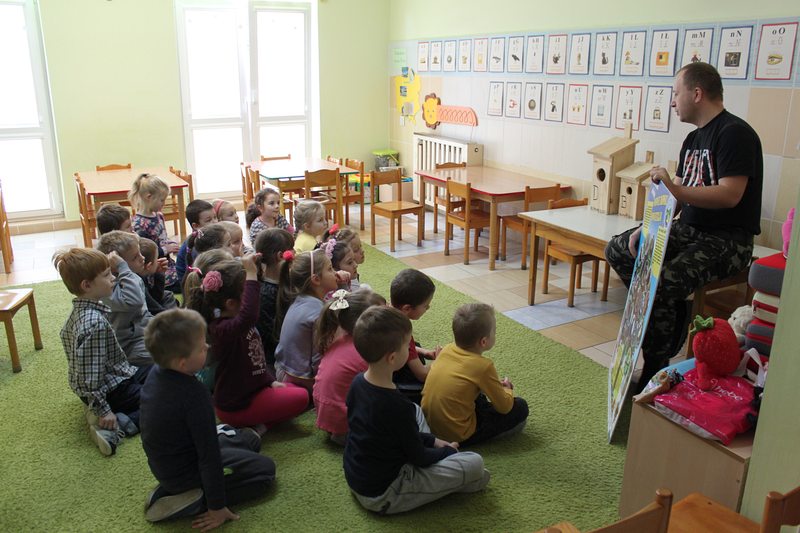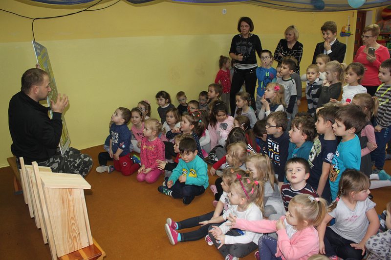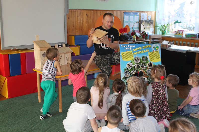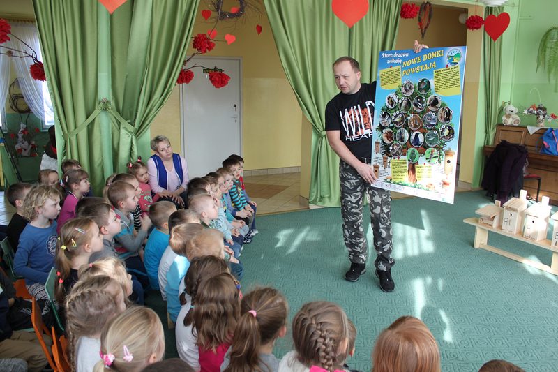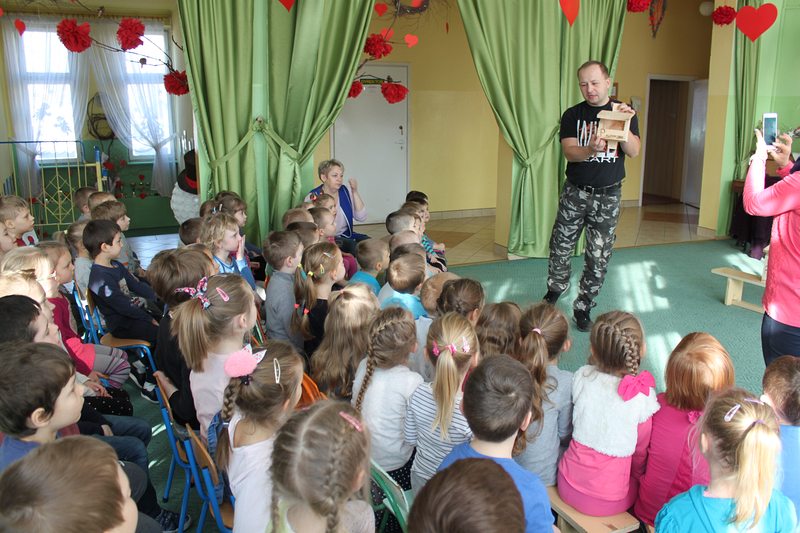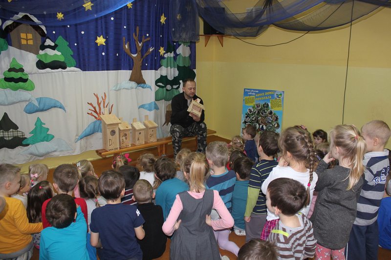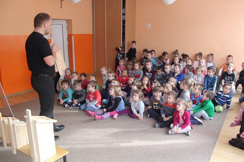 Przedszkole lub szkołę odwiedza ornitolog, który ma ze sobą pięć budek przeznaczonych dla różnych gatunków ptaków oraz tablice edukacyjną, obrazującą przeznaczenie danej budki dla danego gatunku ptaków.