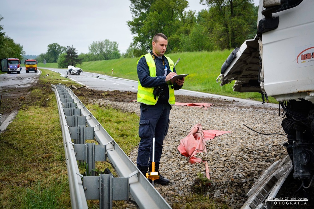 Policjanci pracują na miejscu wypadku, do którego doszło w Tarnobrzegu na Wisłostradzie. Kierująca samochodem osobowym czołowo zderzyła się z ciężarówką. W wypadku zginęło dziecko będące pasażerem osobówki. Zablokowana jest droga wojewódzka nr 871 w kierunku Mielca. Policjanci kierują na objazdy.