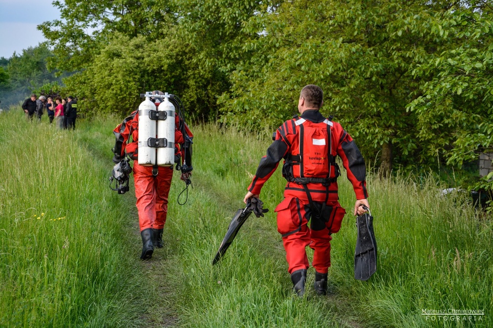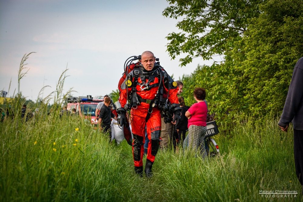 Po dojeździe na miejsce, strażak ubrał się w suchy skafander nurkowy wraz z pełną twarzową maską. Wyposażony w specjalny sprzęt i zabezpieczony zszedł pod wodę w celu rozpoznania dlaczego śluza przecieka, powodem przecieków okazała się kostka brukowa, która blokowała klapę uniemożliwiając jej zamknięcie.