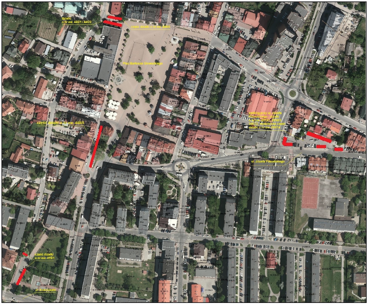 - Parking przy ul. Józefa Piłsudskiego – działki 2062/1, 2058/3, 2067/2, wydzielona część działki 2067/4,