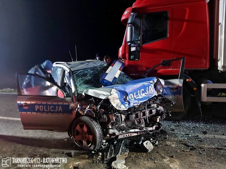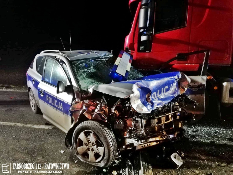 W miejscowości Jaślany (pow. mielecki), policjanci chcąc utrudnić ucieczkę kierującemu, ustawili radiowóz z włączonymi sygnałami świetlnymi i dźwiękowymi prostopadle do osi jezdni. Widząc nadjeżdżający w ich kierunku z dużą prędkością samochód zorientowali się, że kierujący nie reaguje na próbę zatrzymania i wybiegli z radiowozu. W tym momencie rozpędzony volkswagen uderzył w policyjny pojazd. Siła uderzenia była tak duża, że radiowóz przemieścił się i uderzył w stojący na prawym pasie samochód ciężarowy, którego kierowca zatrzymał się w bezpiecznej odległości, by nie przeszkadzać w policyjnej akcji.