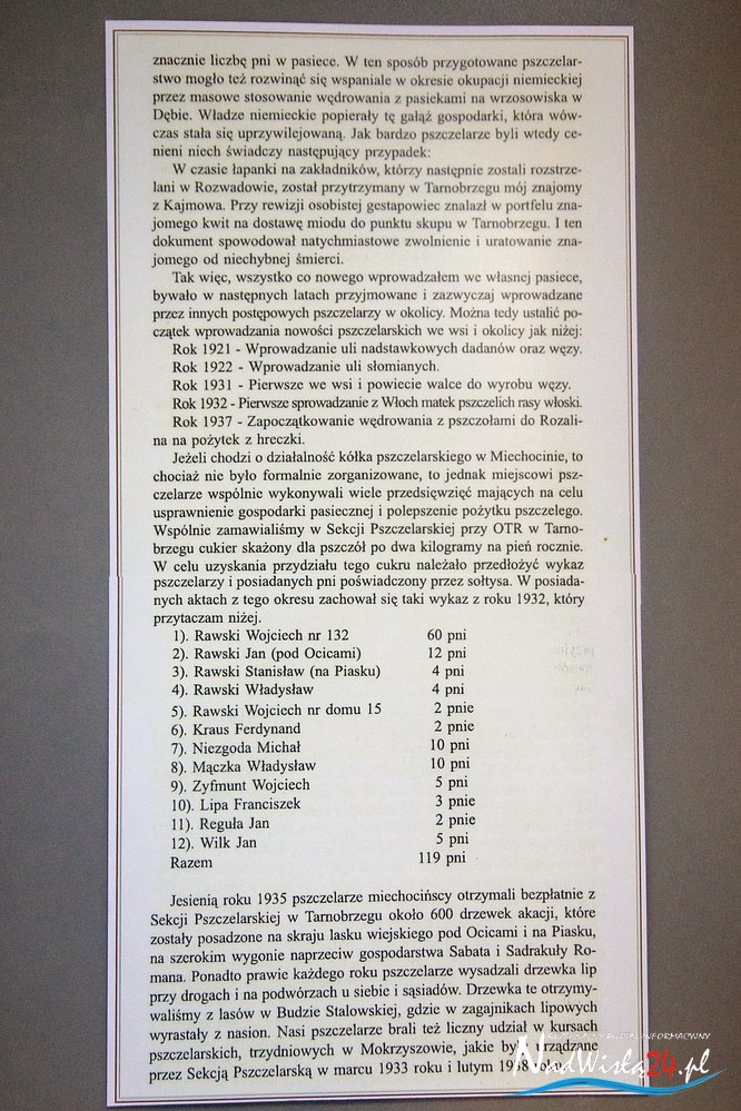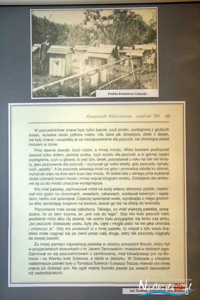 Integralną część wystawy stanowią archiwalne fotografie wybitnych pszczelarzy, którzy włożyli wielki wkład w rozwój pszczelarstwa. Wśród nich nie zabrakło też postaci z Tarnobrzega i okolic. Prezentowane archiwalne zdjęcia pasiek przydomowych w Tarnobrzegu, Miechocinie, Chmielowie i Zakrzowie, publikacje, rękopisy i maszynopisy artykułów Wojciecha Rawskiego, dokumenty (legitymacje) członków Powiatowego Koła Pszczelarzy czy kronika Okręgowego Związku Pszczelarzy w Sandomierzu, prowadzona od 1975 roku, świadczą o wieloletnich tradycjach pszczelniczych w naszym powiecie.