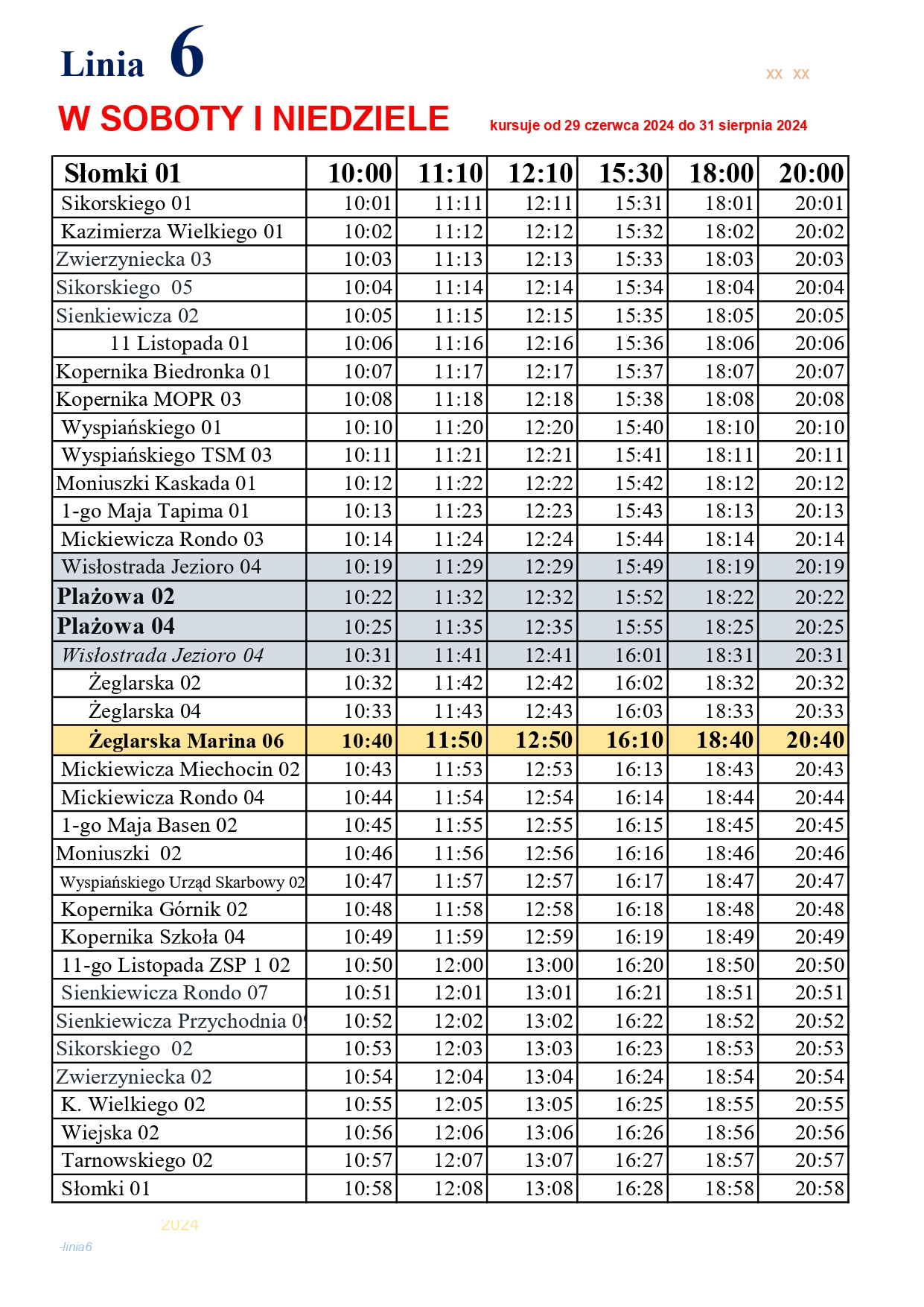 Od najbliższej soboty (29 czerwca 2024 r.) w DNI WOLNE zmienia się trasa linii „6” nad Jezioro Tarnobrzeskie i zostaje ona WYDŁUŻONA na ulicę PLAŻOWĄ”