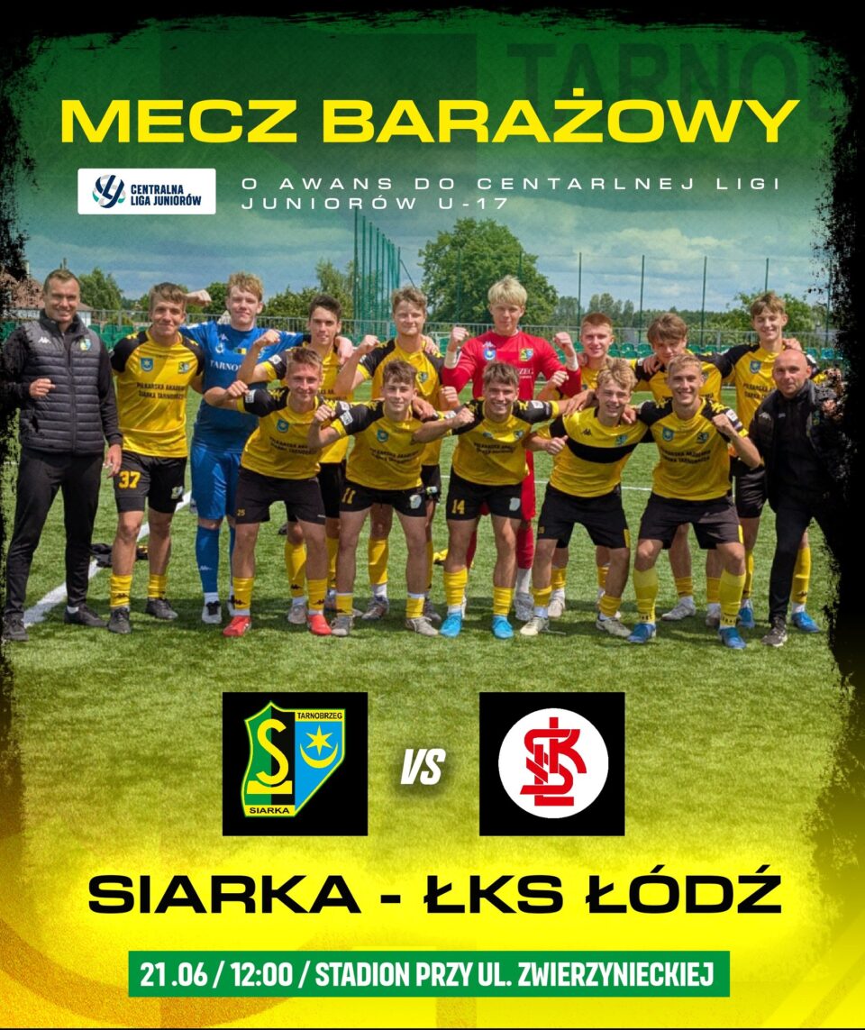 Portal NadWisłą 24.pl zaprasza na transmisję pierwszego meczu barażowego o awans do Centralnej Ligi Juniorów U-17, pomiędzy Siarką Tarnobrzeg a ŁKS Łódź. Spotkanie rozegrane zostanie w sobotę 21 czerwca br. na boisku przy ul. Zwierzynieckiej. Początek godz.12.