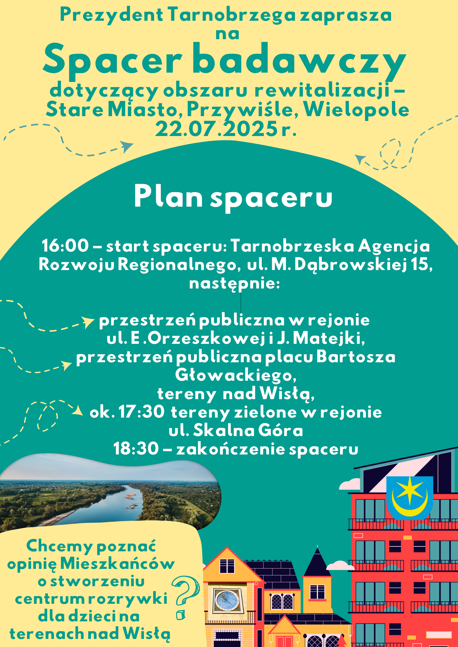 – Tereny nad Wisłą, (w tym etapie spaceru prośba do uczestników o wypełnienie ankiet dotyczących ich wizji powstania i zagospodarowania centrum rozrywki dla dzieci),