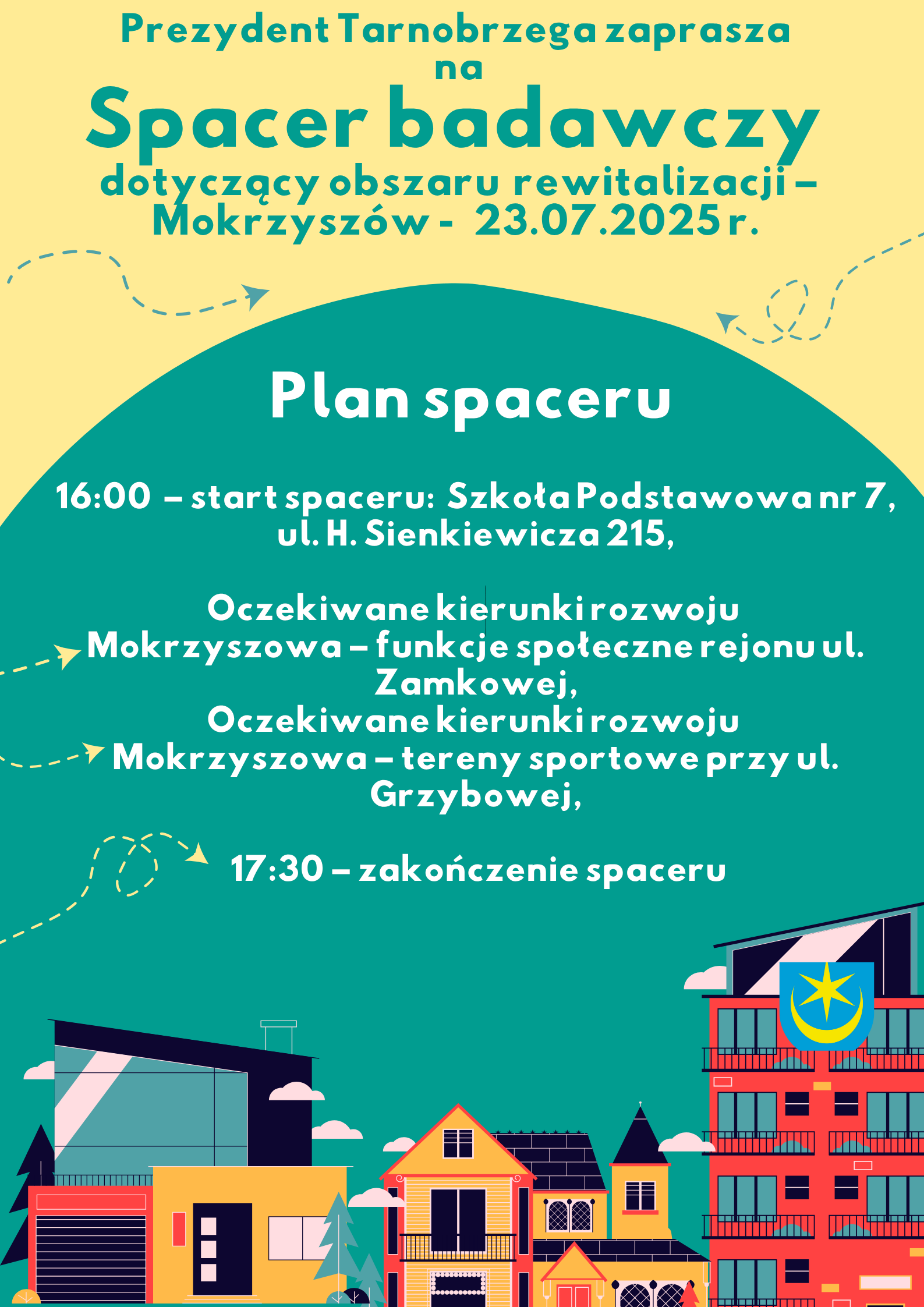 - 16:00 – spotkanie uczestników pod budynkiem Tarnobrzeskiej Agencji Rozwoju Regionalnego S.A. w Tarnobrzegu, ul. Marii Dąbrowskiej 15 – powitanie uczestników,- Przestrzeń publiczna w rejonie ul. Elizy Orzeszkowej i Jana Matejki,
