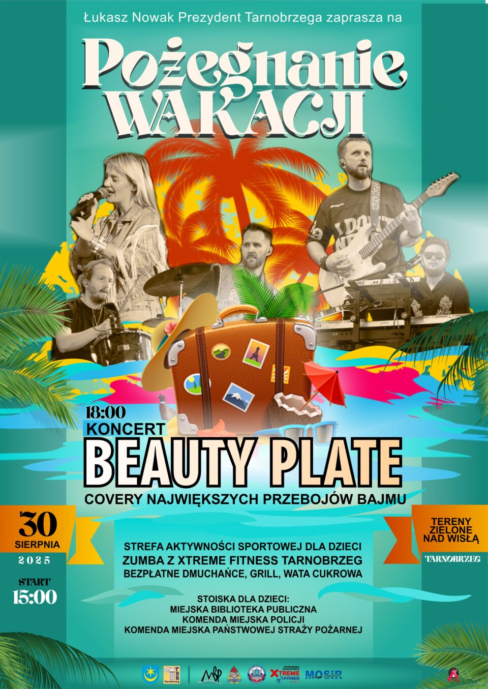 Choć wakacje dobiegają końca, w Tarnobrzegu pożegnamy je w wyjątkowy sposób – radośnie, muzycznie i rodzinnie. 30 sierpnia 2025 roku na Terenach Zielonych nad Wisłą odbędzie się wielki piknik miejski „Pożegnanie Wakacji”, pełen atrakcji dla dzieci, młodzieży i dorosłych.Muzyczną gwiazdą wieczoru będzie zespół Beauty Plate, który o godz. 18:00 zaprezentuje covery największych przebojów zespołu Bajm. To będzie koncert pełen energii i wspomnień, które doskonale wpiszą się w klimat kończącego się lata.