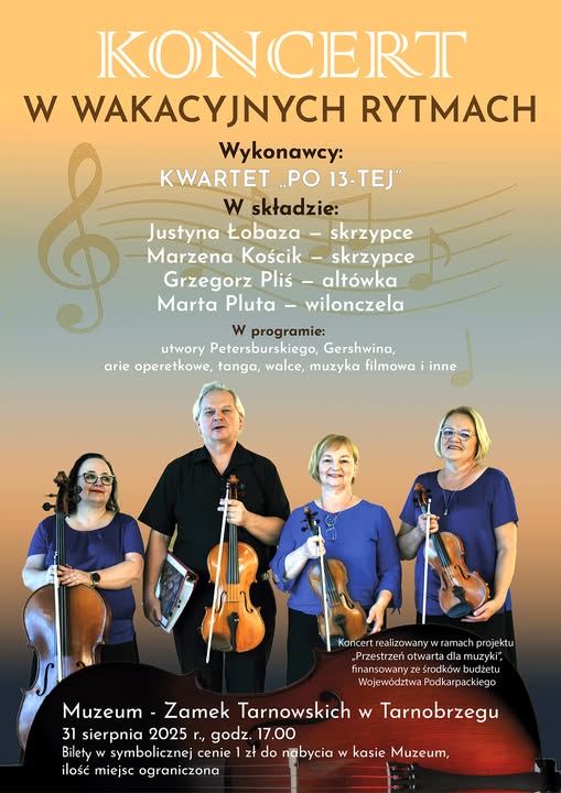 Muzeum – Zamek Tarnowskich w Tarnobrzegu i Filharmonia Rzeszowska zapraszają na koncert zatytułowany „W wakacyjnych rytmach” w wykonaniu kwartetu „Po 13-tej” w składzie: