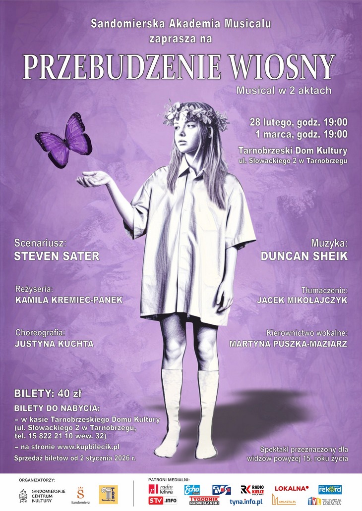 Sandomierska Akademia Musicalu zaprasza na wznowiony po 9 latach, wyjątkowy musical rockowy z muzyką na żywo pt. „Przebudzenie Wiosny”! To projekt międzyregionalny, bo powstaje w Sandomierzu, przygotowywany przez Sandomierskie Centrum Kultury, ale z udziałem młodych tancerzy, wokalistów, aktorów i muzyków z Sandomierza, Tarnobrzega, Kolbuszowej, Staszowa, Rzeszowa, a nawet Krakowa.