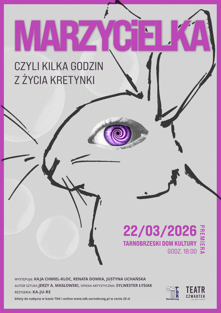 Premiera spektaklu „Marzycielka, czyli kilka godzin z życia kretynki” odbędzie się 22 marca br. w Tarnobrzeskim Domu Kultury. Bilety w cenie 20 zł można już kupować w kasie TDK oraz online na stronie www.tdk.tarnobrzeg.pl