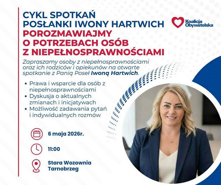 Już w środę, 6 maja br., w Tarnobrzegu odbędzie się wydarzenie dedykowane środowisku osób z niepełnosprawnościami. W ramach cyklu spotkań „Porozmawiajmy o potrzebach osób z niepełnosprawnościami”, mieszkańcy będą mieli okazję spotkać się z posłanką Iwoną Hartwich.